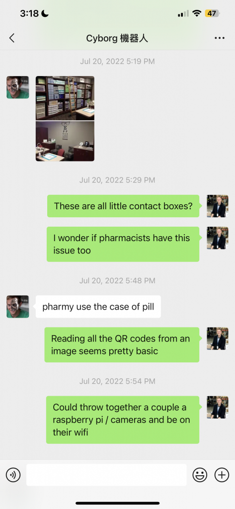 Eventually we realized it needed to sort a high value item or they wouldn’t care about sorting it. And it needed to something a highly paid person like an optometrist or pharmacist waste their time on or it less no sense to have a robot do it instead. The value of the time was crucial.